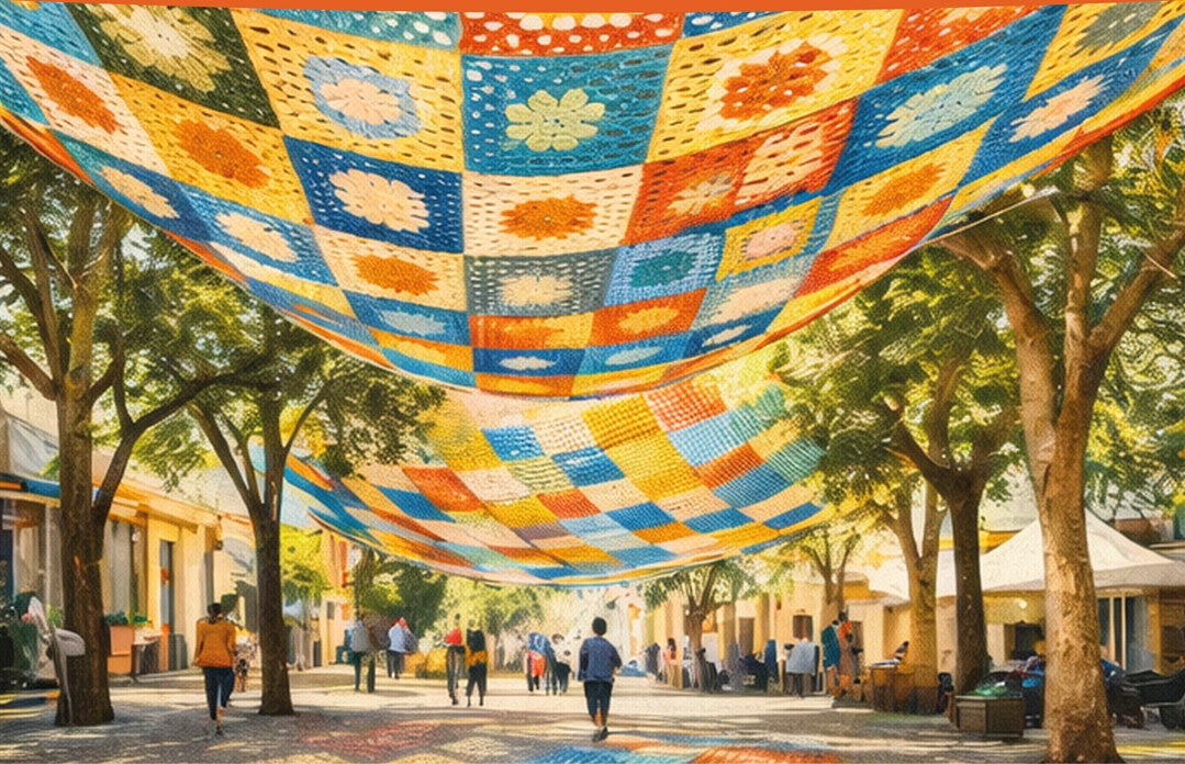 Nous créons ensemble une canopée au crochet qui sera suspendue pendant le festival avant de voyager vers d’autres lieux et événements.